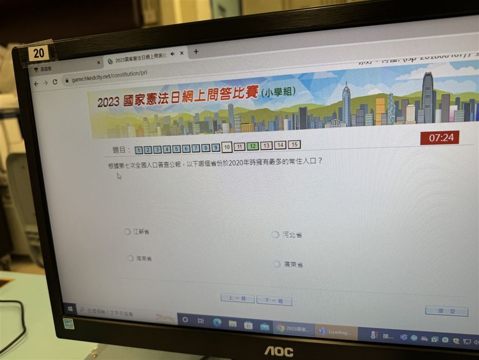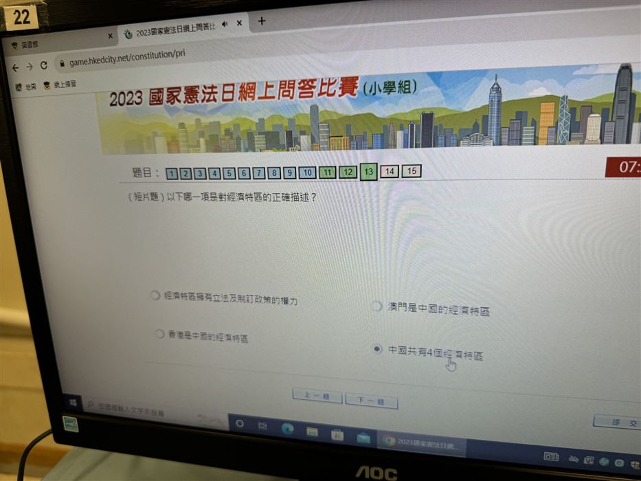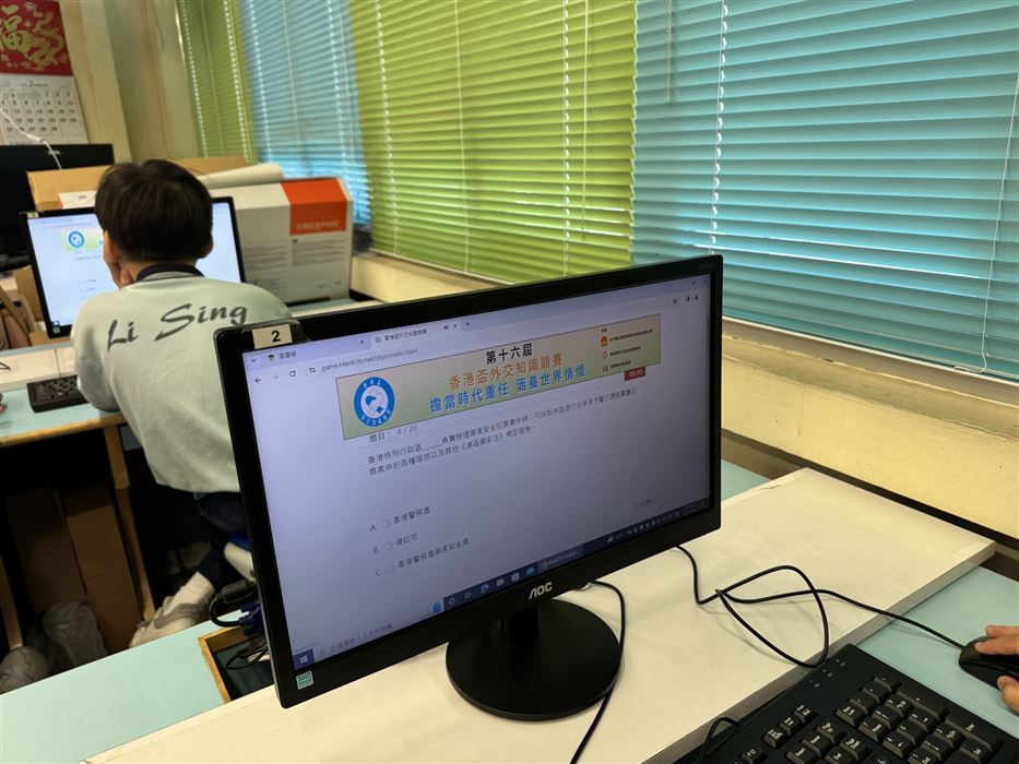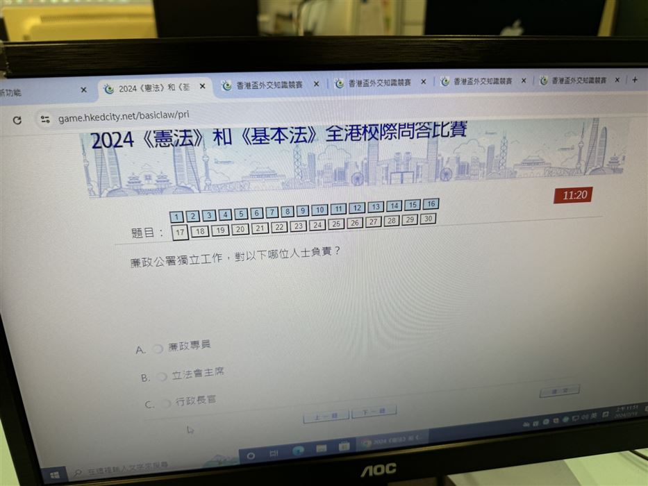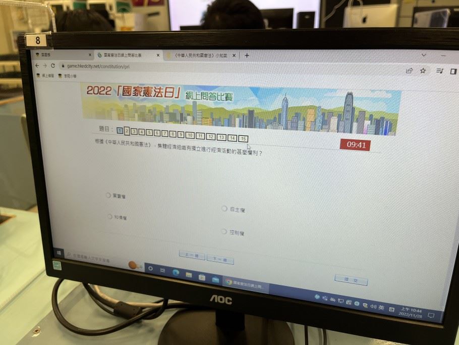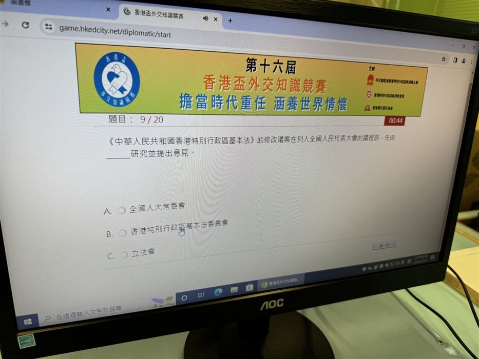 每名學生只可參賽一次,須回答30條題目,限時15分鐘題目內容集中於《憲法》和《基本法》、抗戰勝利、國情、國家最新發展及指定的影片內容。學生們都認真作答,透過活動,提升了學生對《憲法》和《基本法》的興趣。