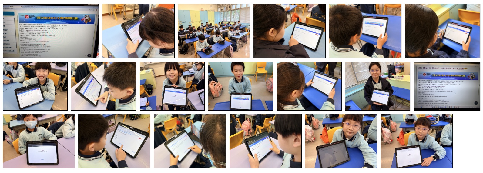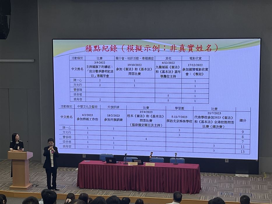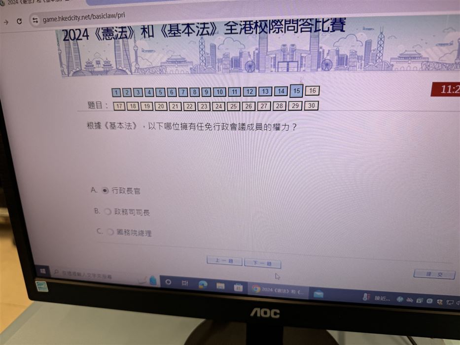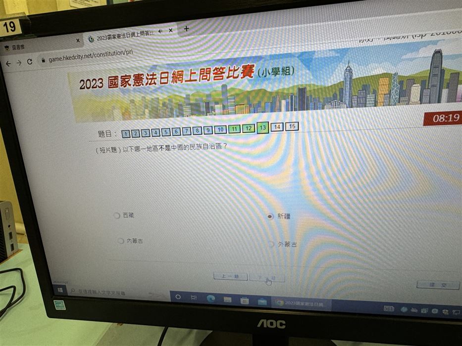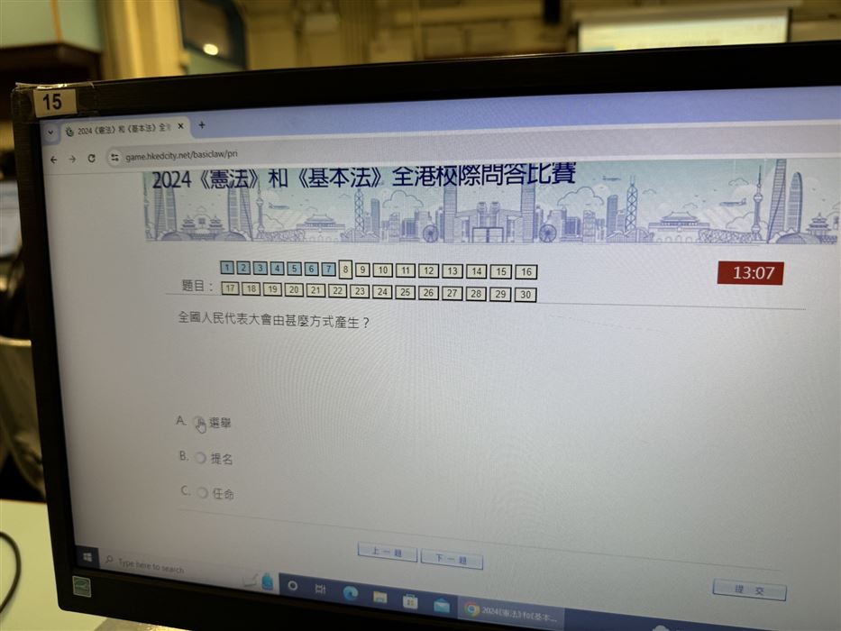 每名學生只可參賽一次,須回答30條題目,限時15分鐘題目內容集中於《憲法》和《基本法》、抗戰勝利、國情、國家最新發展及指定的影片內容。學生們都認真作答,透過活動,提升了學生對《憲法》和《基本法》的興趣。