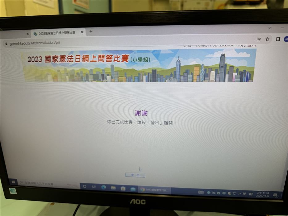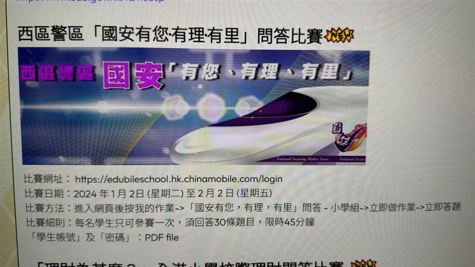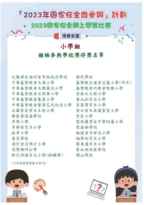 為了提升學生對對《憲法》、《基本法》及國家安全的認識,加強認識法治和國情,明白維護國家安全的重要性,我們在2023年4月14日(星期五)至4月26日(星期三)舉辦了《2023國家安全網上問答比賽》。透過比賽,小四至小六學生可以了解國家安全與我們日常生活息息相關,以及明白國家安全對個人社會和國家同樣重要。