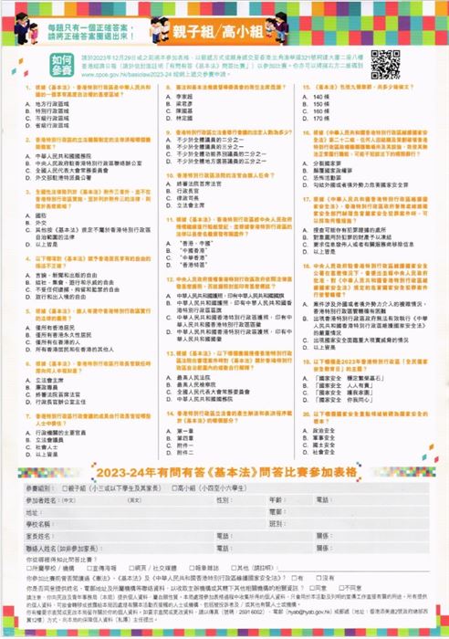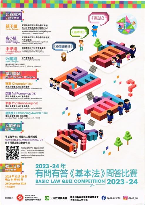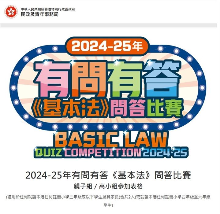 民政及青年事務局、公民教育委員會及憲法和基本法推廣督導委員會轄下《憲法》、《基本法》及《香港國安法》工作小組本地社區分組舉辦「有問有答《基本法》問答比賽」,期望參加者能藉參加比賽提升對《憲法》和《基本法》的關係、《基本法》及其歷史,以及維護國家安全的認識。