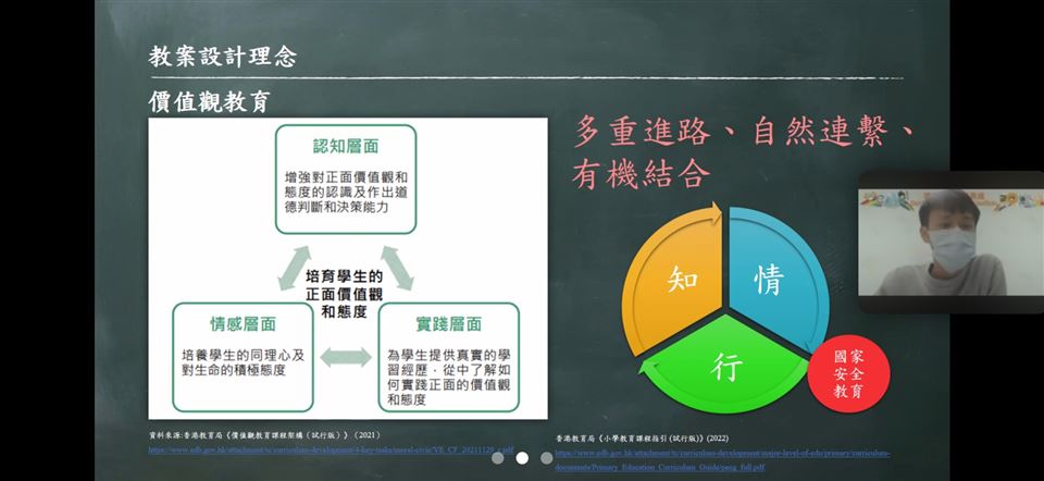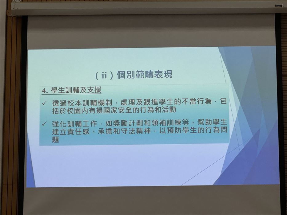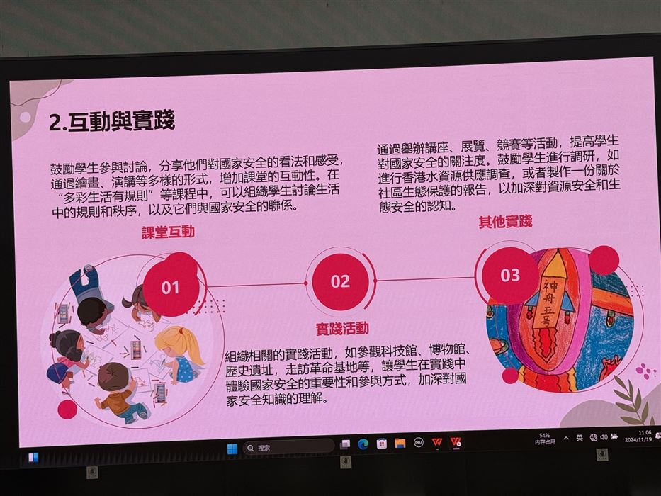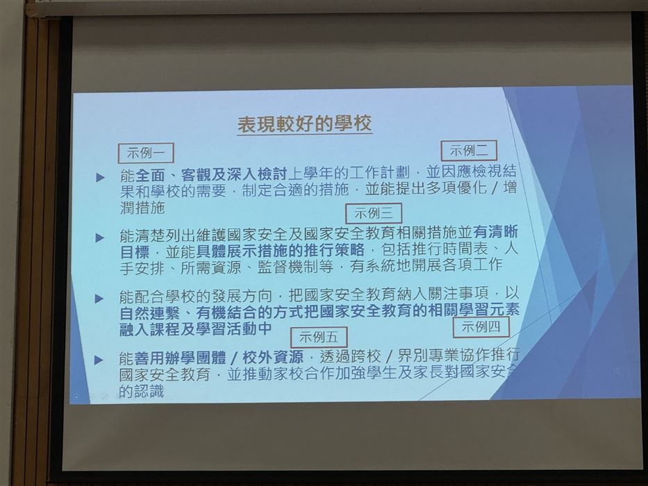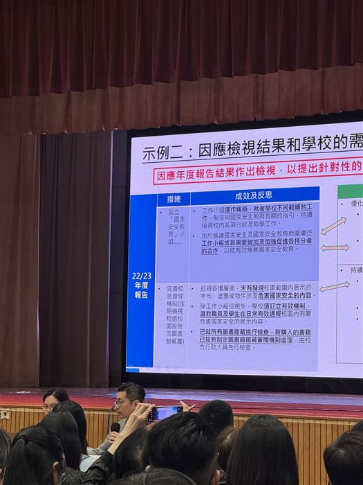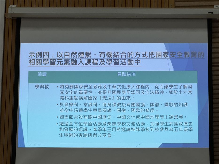 教師透過參與觀摩公開課、專業交流及分享,促進其自我反思及分析的能力,以有效地完善學與教的策略,促進個人的專業發展。同時,教師可在學校強化國民及國家安全教育,提升學生在課堂內外、不同科目和價值觀教育的學習動機,培育學生的國家觀念,了解國家的最新發展和國情,正確認識國家歷史、欣賞中華文化及傳統價值觀,建立國民身份認同,並成為尊重法治、守法的良好國民,共同維護國家安全。