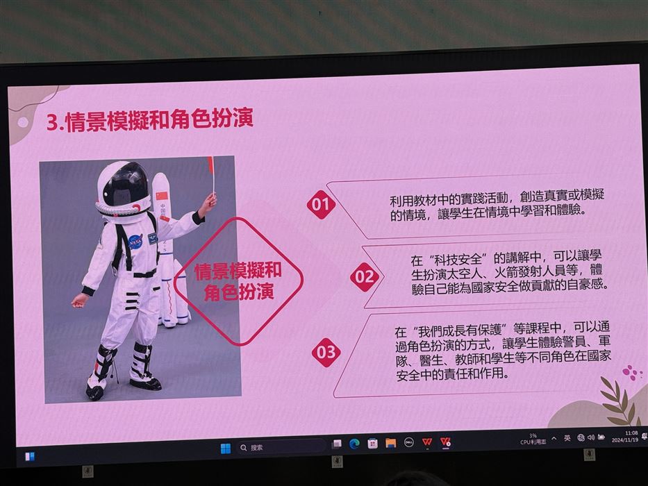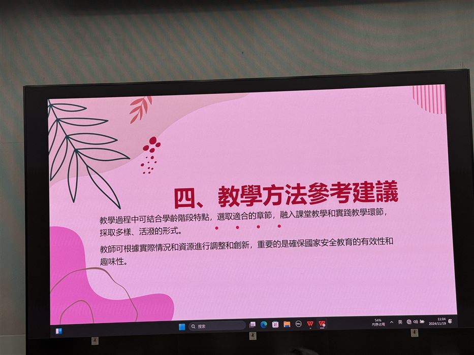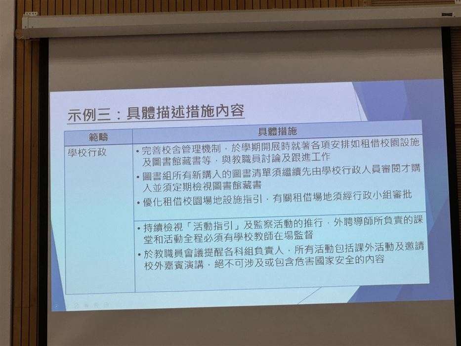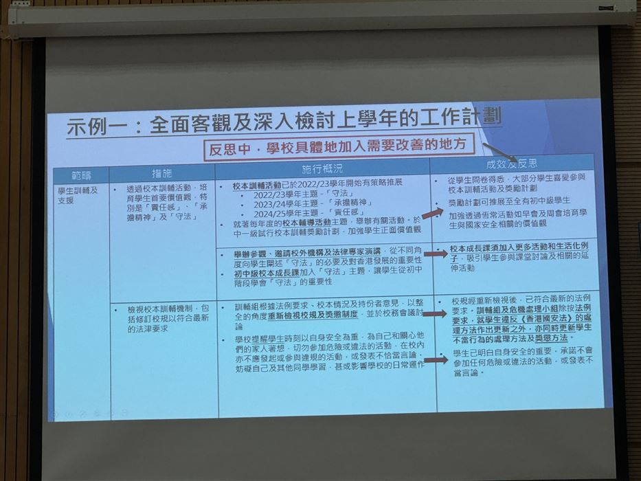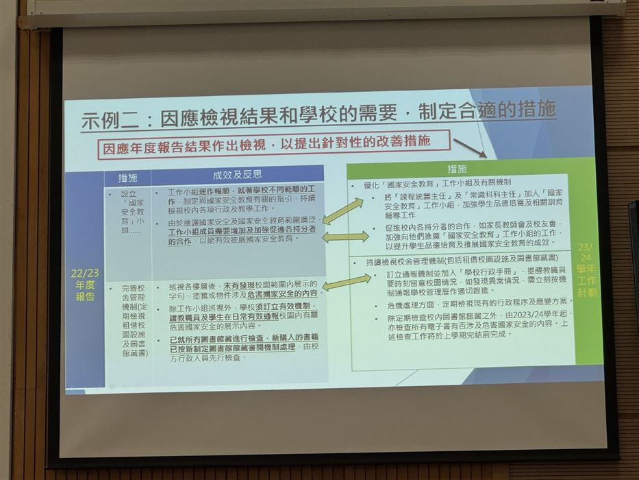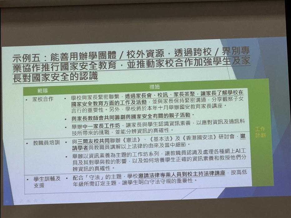 教師透過參與觀摩公開課、專業交流及分享,促進其自我反思及分析的能力,以有效地完善學與教的策略,促進個人的專業發展。同時,教師可在學校強化國民及國家安全教育,提升學生在課堂內外、不同科目和價值觀教育的學習動機,培育學生的國家觀念,了解國家的最新發展和國情,正確認識國家歷史、欣賞中華文化及傳統價值觀,建立國民身份認同,並成為尊重法治、守法的良好國民,共同維護國家安全。