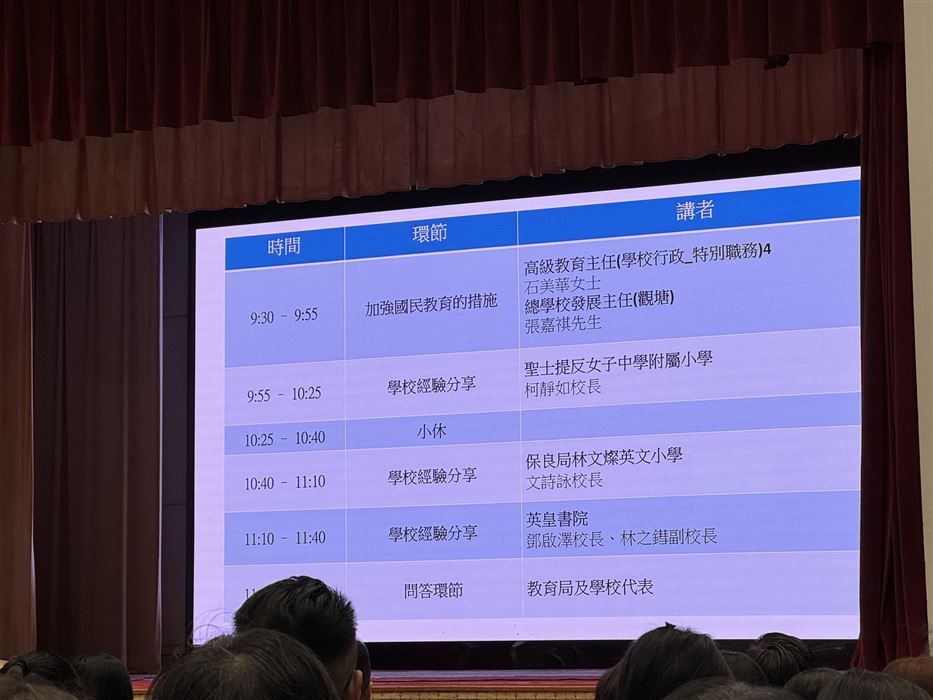 本校的國情教育組老師,包括王倩衡老師以及江偉雄老師在2025年9月29日到教育局九龍塘教育服務中心西座 4樓演講廳參加了專業教師講座,還有兩間學校為大家作出專題分享,包括:香港教育工作者聯會黃楚標學校黃錦良校長及林美珊副校長,以及曾璧山崇蘭中學何沛勝校長。