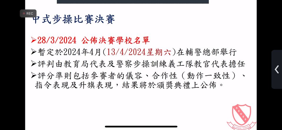 5B 王璽媛在2025年9月27日(星期六)成功考核「基本步操章證書」、在2025年11月8日(星期六)成功考核「進階步操章證書」以及在2025年11月15日(星期六)成功考核「旗手護旗初級章」。考核包括制服檢查、步操考核及筆試。通過考核的隊員可於當天購買有關專章。升旗隊員需要逢星期四的「多元智能」課時段參加步操及旗手升旗訓練,透過紀律性訓練,培養隊員成為良好自律的公民。