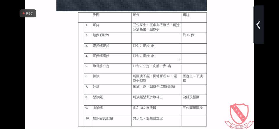 為了培訓本校的升旗隊,本校在9月13日開始,派出老師出席了為期四天,由香港升旗隊總會舉行的升旗隊導師培訓計劃,之後會在多元活動時段訓練本校升旗隊。