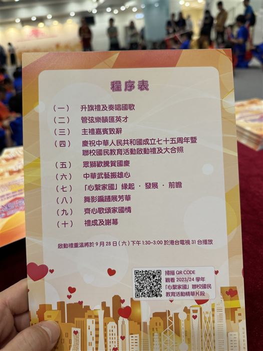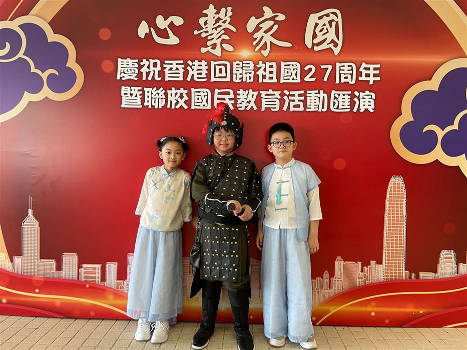 學年65所官立學校以「心繫家國」為主題,舉辦一系列的國民教育聯校活動,加深學生對中國歷史及文化的認識,培養學生愛國愛家的情懷。為慶祝香港回歸祖國二十六周年,官立學校將於2023年6月30日下午3時於伊利沙伯中學舉辦聯校活動匯演,藉以讓學生透過欣賞多元化的文化藝術,拓寬視野及培養家國的情懷。本校3名學生分別代表學校參與百人大合唱和鼓樂合奏,展現及發揮其音樂才華。