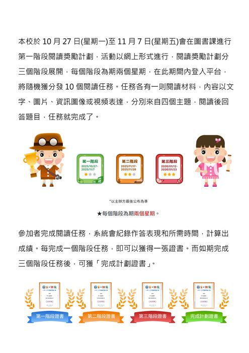 本校於10月2日(星期四)至10月31日(星期五)會在圖書課進行網上學習活動,活動以網上形式進行,學生參與次數不限。活動設有三關,每一關由一段影片及數道問題組成。學生在觀看相關影片後並答對超過一半問題,即可通關。完成不同關卡數量的學生可獲相應獎勵。