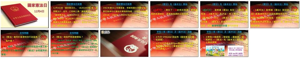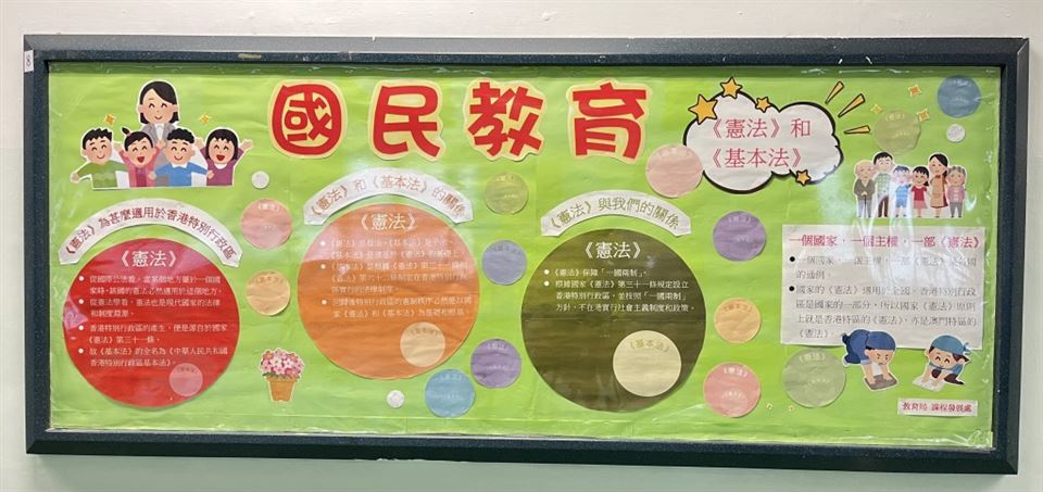 為了促進學生對《憲法》和《基本法》的認識,我們特別製作了憲法及基本法壁報板,培養學生主動關心國家和香港社會的事務,發展他們的領袖才能及拓寬視野,成為有 識見、負責任、具備國家觀念的良好公民。