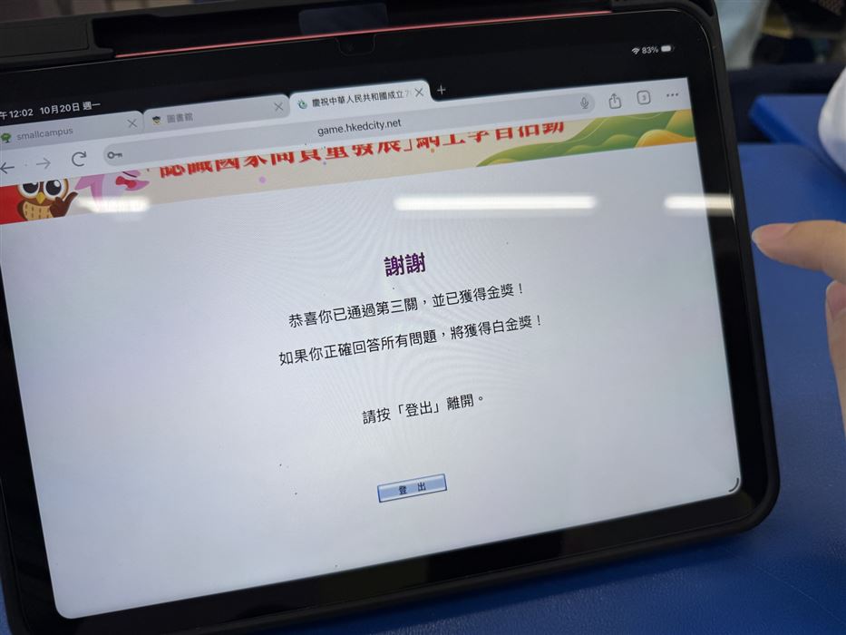 本校於10月2日(星期四)至10月31日(星期五)會在圖書課進行網上學習活動,活動以網上形式進行,學生參與次數不限。活動設有三關,每一關由一段影片及數道問題組成。學生在觀看相關影片後並答對超過一半問題,即可通關。完成不同關卡數量的學生可獲相應獎勵。