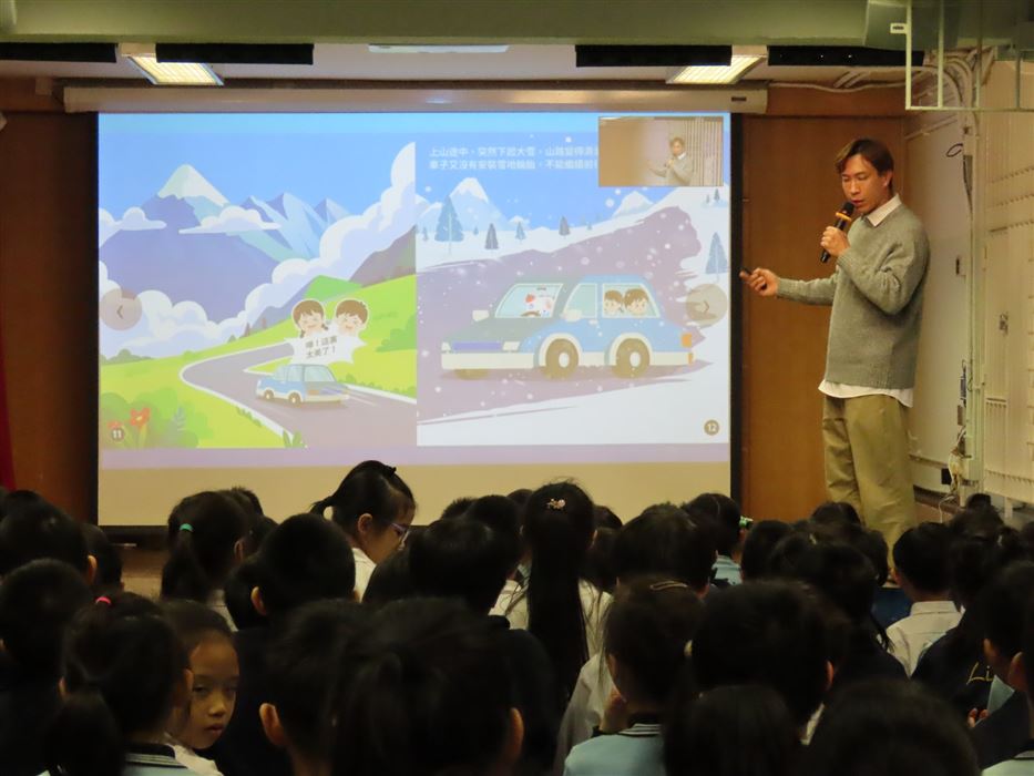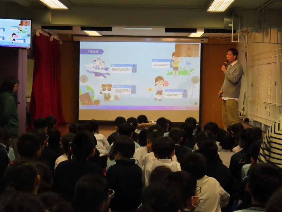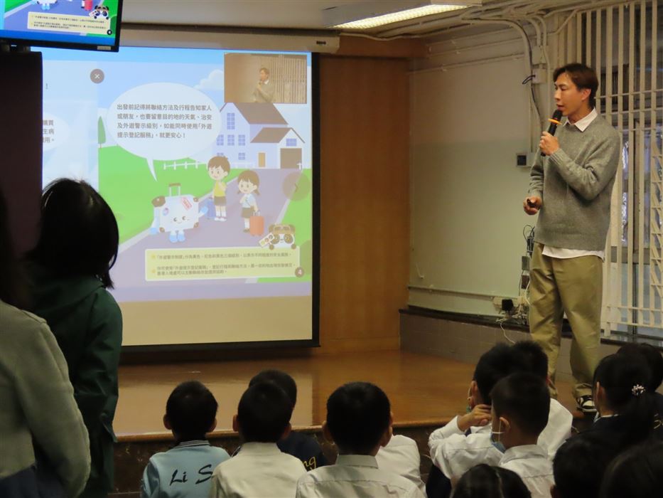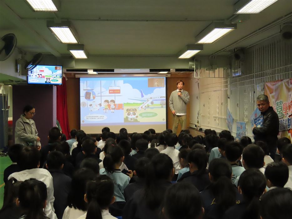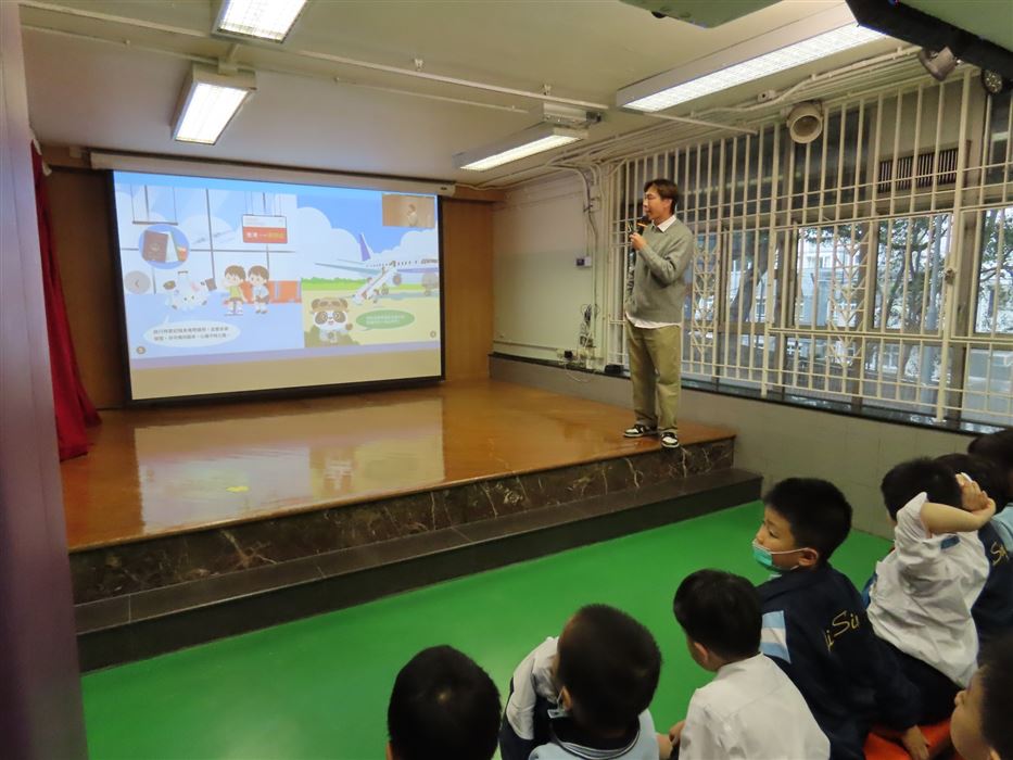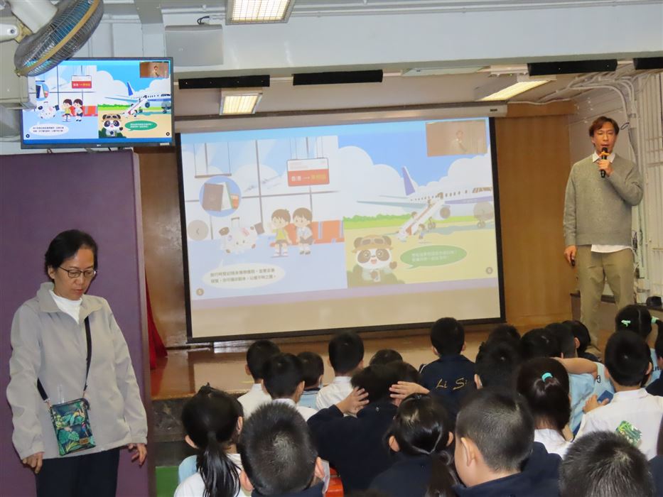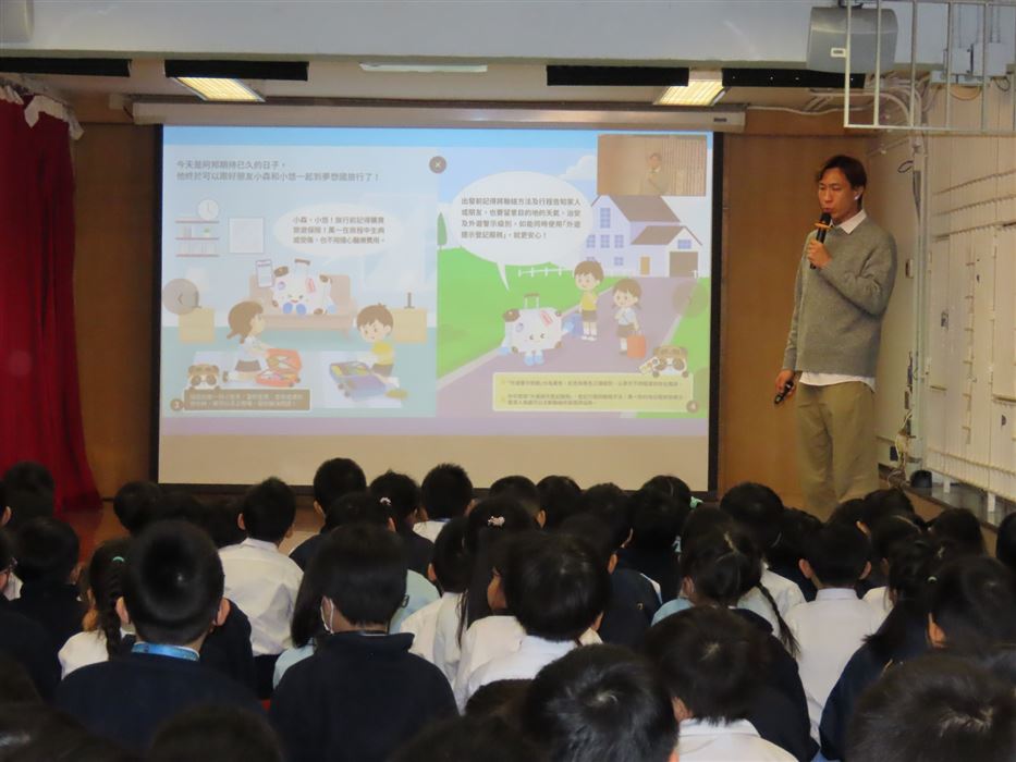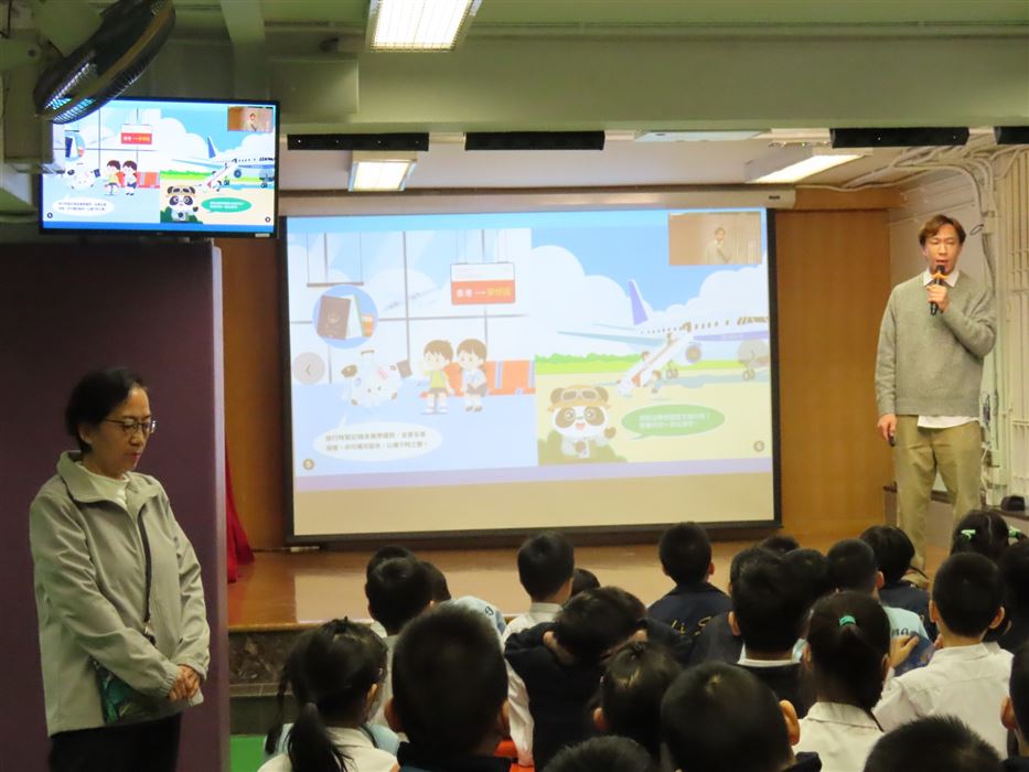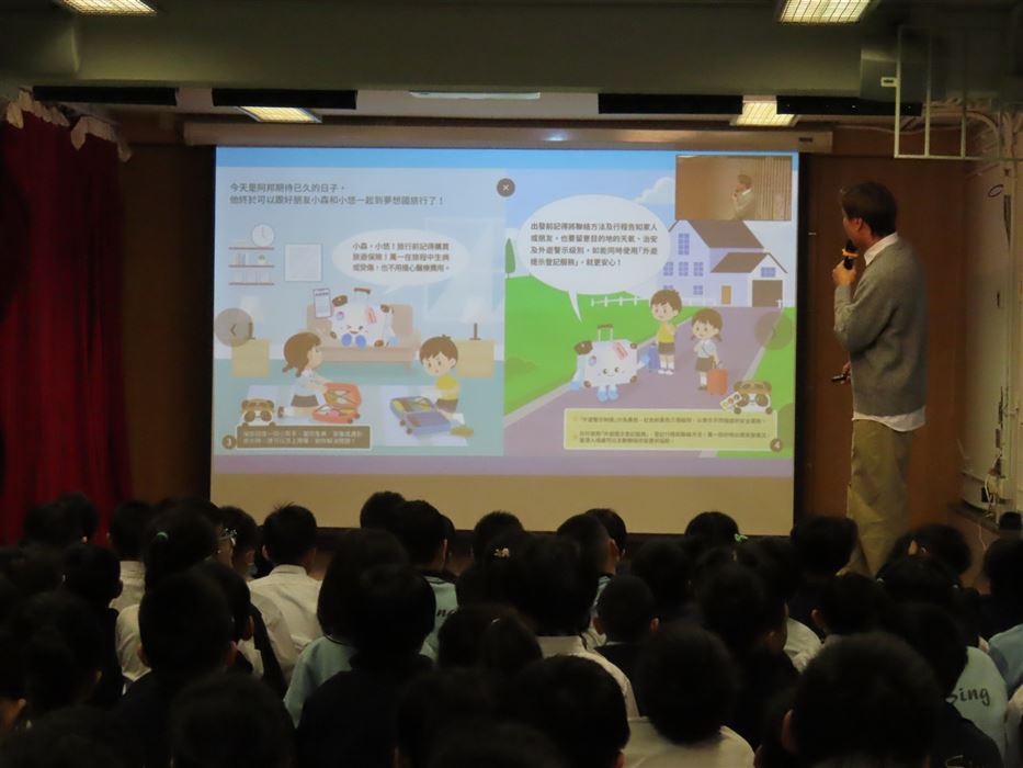 江老師在開始講故事前,詢問學生們曾否去過旅行,大家紛紛告訴老師自己去過的地方。江老師以繪本主角「1868大使——阿邦」與朋友小森、小悠的旅程為主線,講述他們在旅行中遇到的各種情境,如遺失旅行證件、意外受傷等,以分享外遊安全小貼士,讓孩子從小學習旅行中遇到困難的應對方式,並以有獎問答形式與學生親切互動。