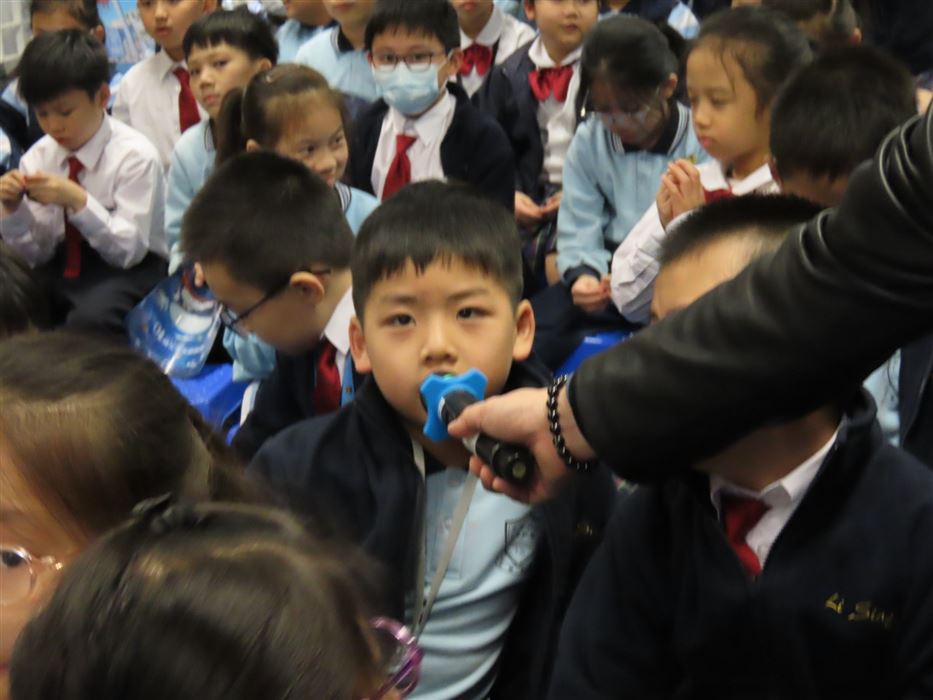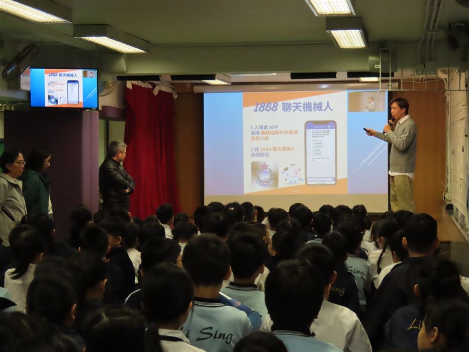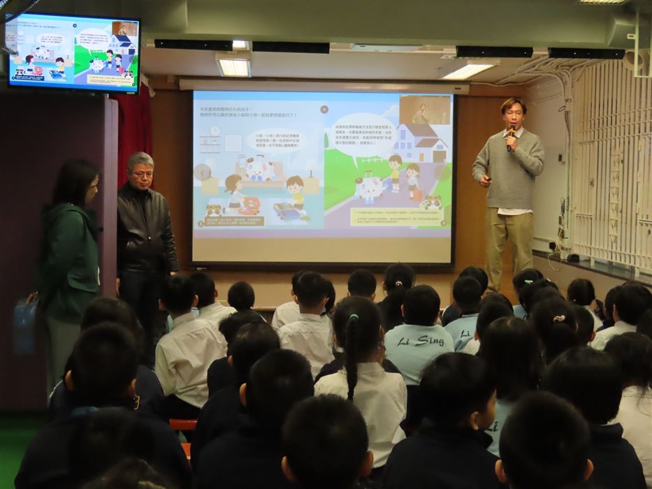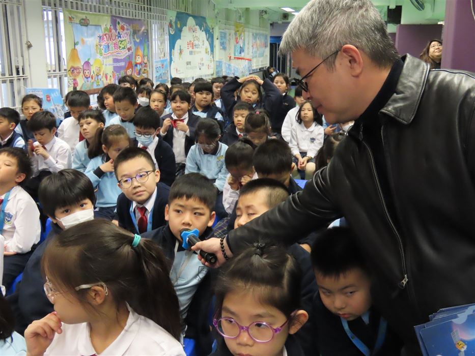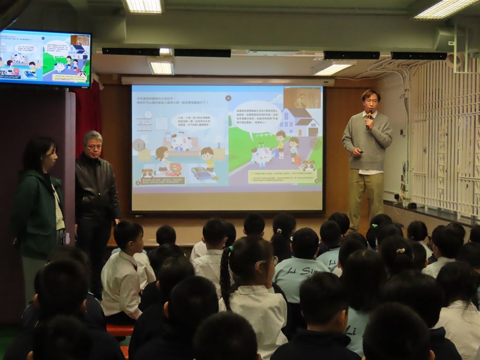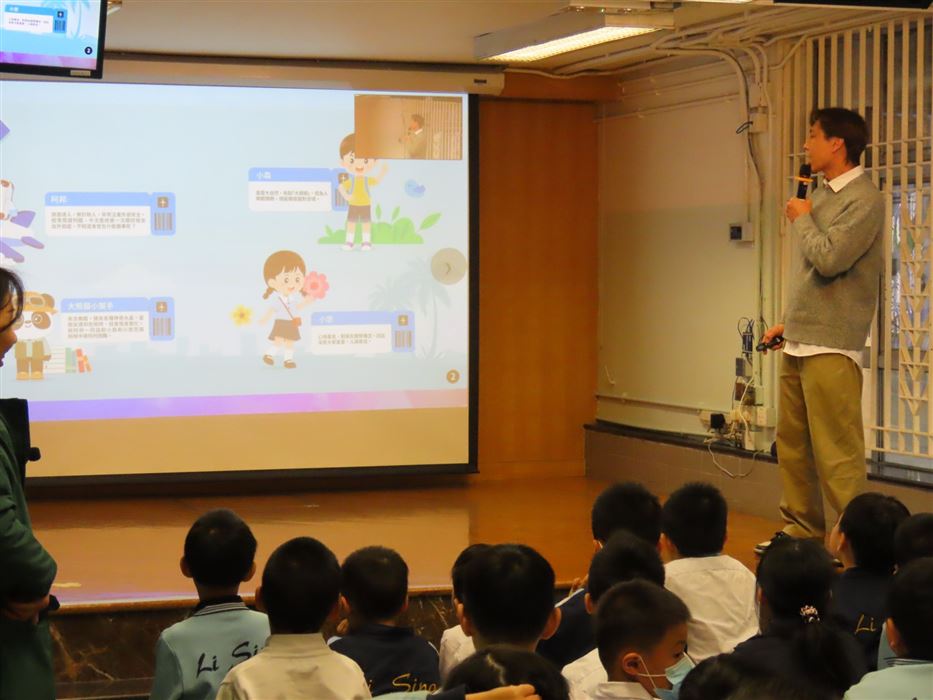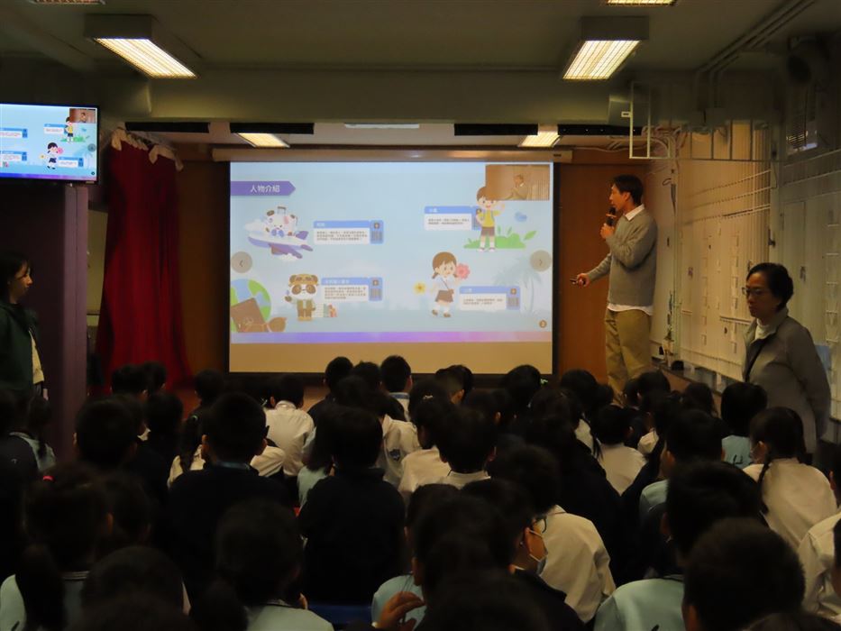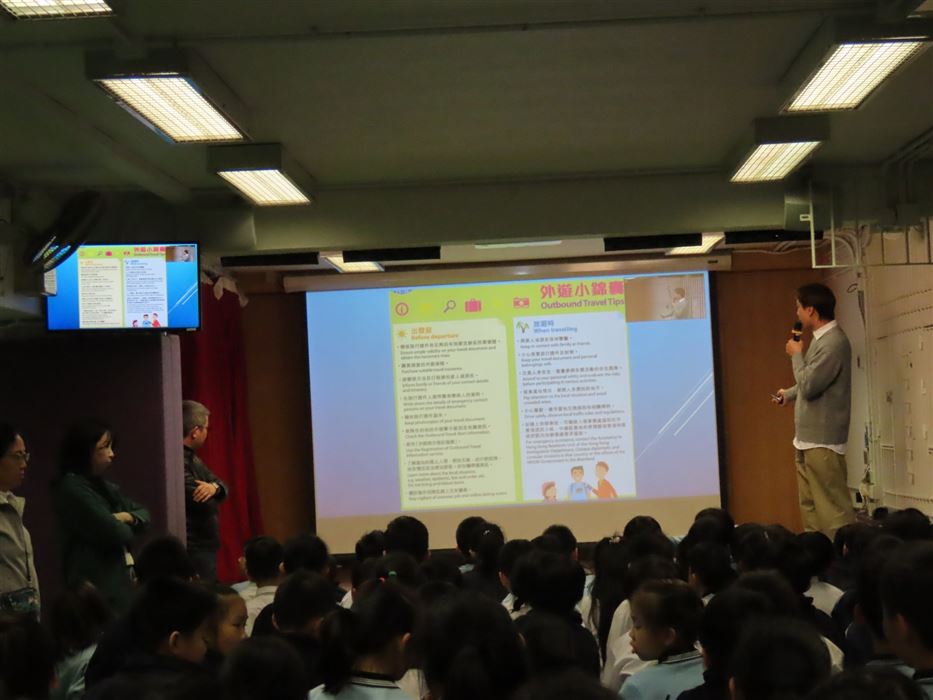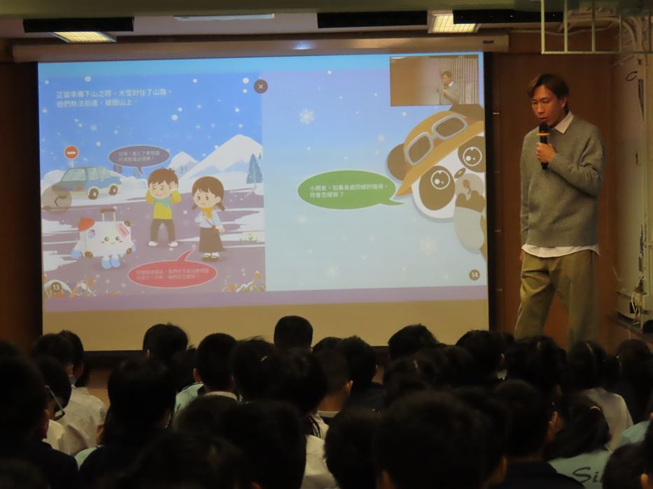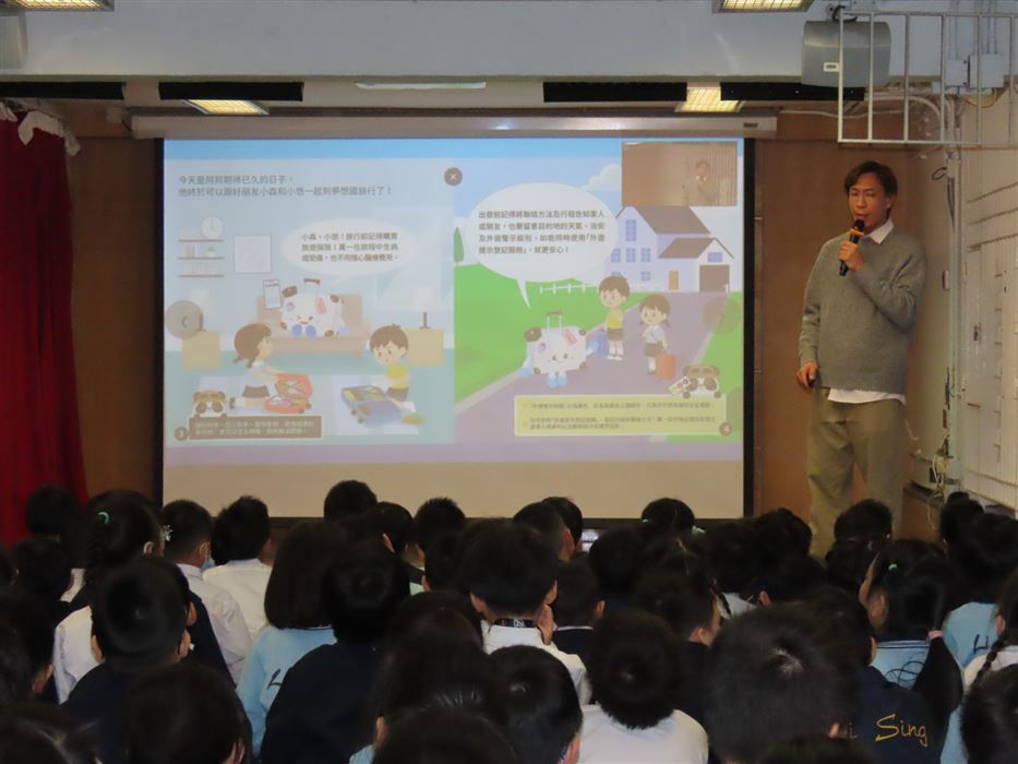 江老師在開始講故事前,詢問學生們曾否去過旅行,大家紛紛告訴老師自己去過的地方。江老師以繪本主角「1868大使——阿邦」與朋友小森、小悠的旅程為主線,講述他們在旅行中遇到的各種情境,如遺失旅行證件、意外受傷等,以分享外遊安全小貼士,讓孩子從小學習旅行中遇到困難的應對方式,並以有獎問答形式與學生親切互動。