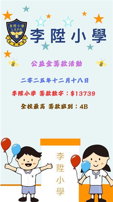 二零二五年十二月十八日是公益金籌款活動,本校籌款金額總數為$13739,全校最高籌款班別是4B。多謝各位勇躍參與!
